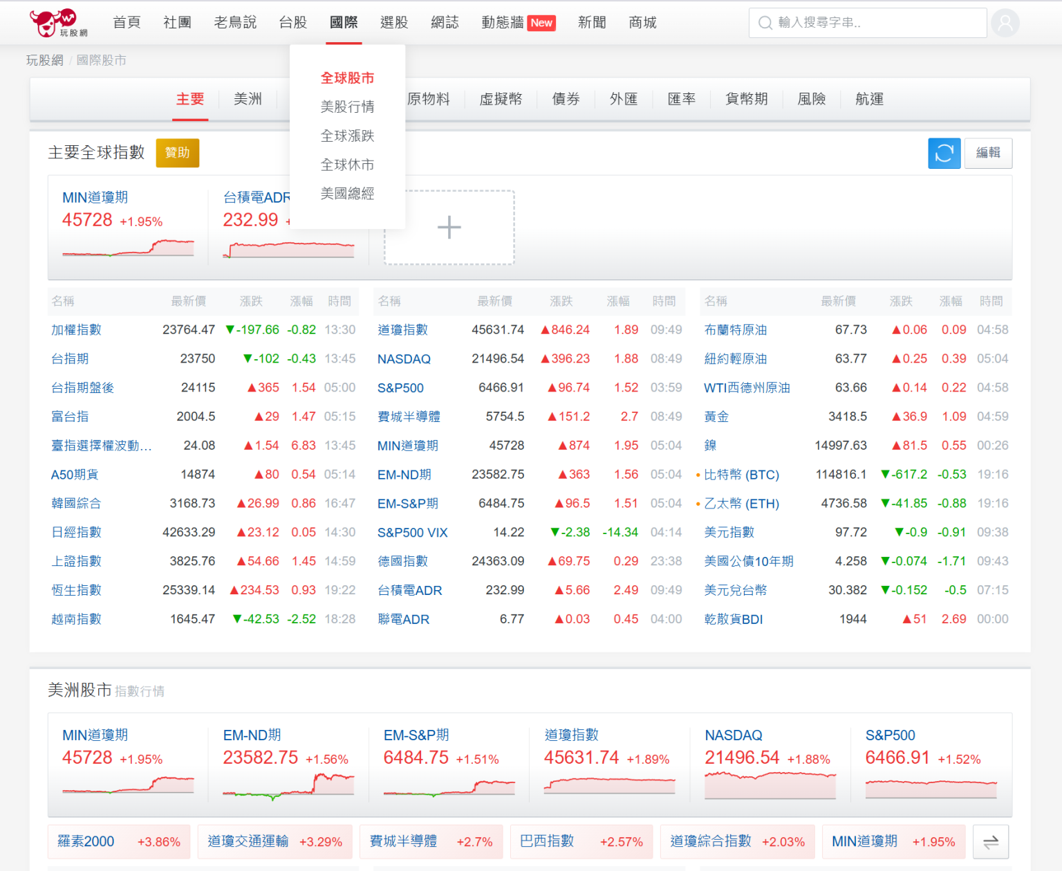 各大國際指數、原物料、公債報價,在玩股網上可以算是滿齊全的,可以透過此網站快速瀏覽資訊。網站上也有其他資訊,像是過去美國經濟數據的歷史紀錄查詢,以及台股各種資料。